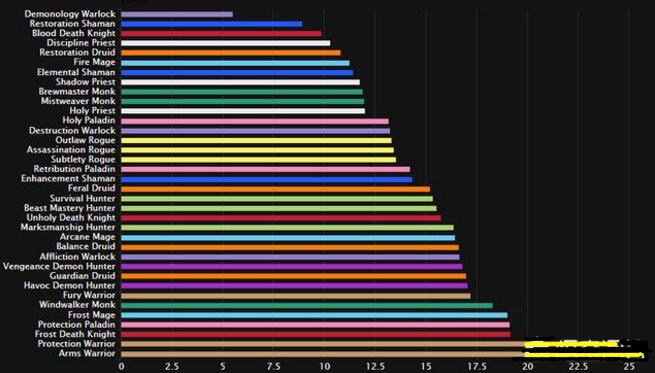 同样,在另一方面,倒数第一死亡率的恶魔术,并不是保命能力极其出众的职业,相反生存能力一贯很出色的冰法却排行第五,以及同为TANK,防战死亡次数比血DK高出如此多,真要分析的话,恐怕要多角度入手了。