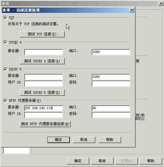 打肯罶N设置界面(MSN菜单-)工具-〉选项-〉连接),点击“高级设置”,打开加速器设置的界面后,按相应的协议填上加速器就可以了。