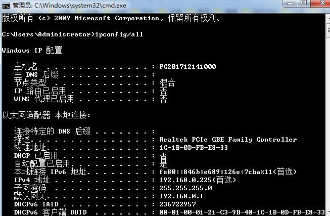 在黑色的窗口中再输入“ipconfig/all”后敲回车键,观察运行的结果中“默认网关(Default Gateway)”后面瞪鯬地址是多少,