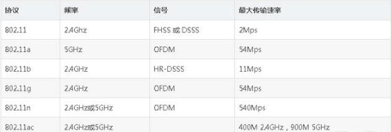 首先我们先来了解下什么是802.11a/b/g/n协议,802.11b和802.11g工作在同一频段上,g能够兼容b,也就是说支持g的网卡都能支持b。802.11n协议为双频工作模式(包含2.4GHz和5GHz两个工作频段)。这样11n保障了与以往的802.11a b, g标准兼容。现在有新型的协议802.11 ac是从802.11 n上发展而来的,有着比802.11n更高的速度,请看下图就知道了。