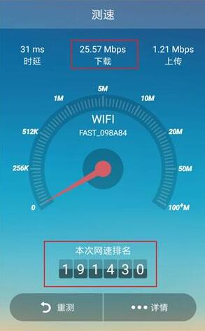 先来看看设置前的网速:时延31ms,下载速度25.57Mbps,上传速度1.21Mbps,网速排名为191430。