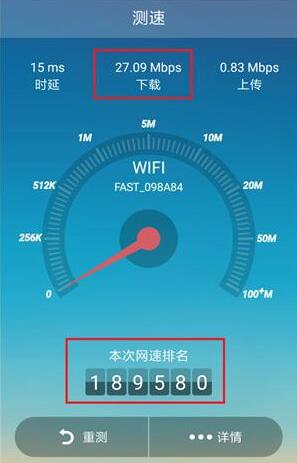 设置完成后,我们还是用同一款软件测试一下设置后的网速。虽然上传速度慢了些许,但时延降低到了15ms;下载速度则上升到了27.09Mbps,网速排名上升到了189580!怎么样?是不是觉得世界都为你改变了!玩游戏再也不怕延迟了,在27加速器的加持下,犹如德芙般顺滑!