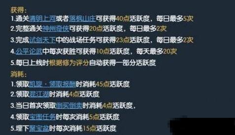 试剑,属于一个战场模式,多人VS多人,每场结束下来会给40点活跃度,每场15分钟!(这里要注意一点,近期更新过后想要在试剑里获得活跃度,没有办法挂机了,如果是后面20%的玩家是没有活跃度的,所以需要去打架!杜绝一部分工作室靠这个挂机刷活跃度!)本人每天都要去打上一场或者两次才够把日常获得铜币的任务做完。个人是推荐的,轻轻松松就拿到了,特别是奶妈!(xw20180809001)