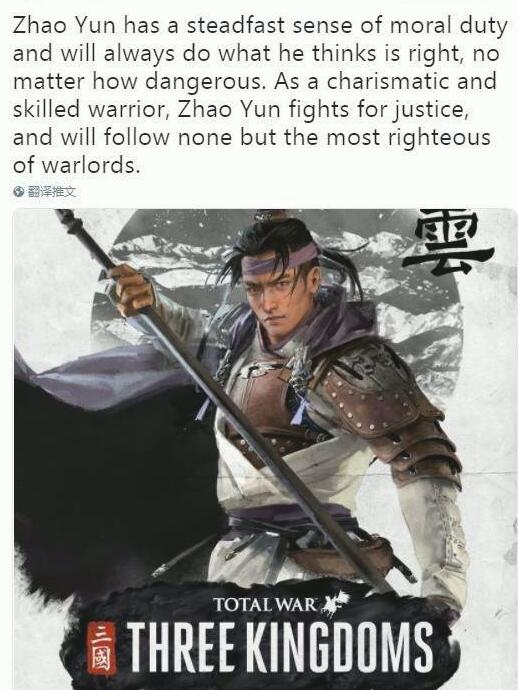 根据《三国:全面战争》官方推特介绍,尽管生逢乱世,但是赵云依旧坚持为正义而战,他只会追随最为正义的领主。