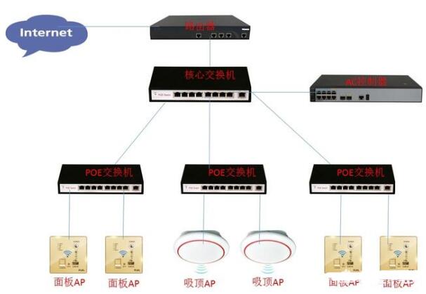 在中心机房接入互联网专线,安装路由器,核心交换机,AC控制器,其他poe交换机到每个楼层,装修的生活房间都布放了网线的直接接poe交换机上,在房间接入面板AP,在楼道,餐厅,会议厅接入吸顶AP,达到无死角覆盖。AC控制器,是用来集中设置管理控制无线AP的;AP是AC的信号端你可以理解为AC的天线,发出无线信号的;POE交换机,跟一般交换机比多了个POE,就是说这样的交换机可以通过网口,网线给AP供电,减芍黀布放位置的取电问题,降低成本与使用方便等。