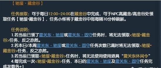 不单单是盗匪入驻藏金谷,就连震关东押镖也新增了藏金谷任务。押镖的护送镖车和采木头繁琐枯燥的游戏模式让玩家反感,如果你想简单的拥有押镖奖励,那么可以领取震关东驰援藏金谷任务,不用采木头,也不用护送镖车,能够更加简单的完成,但是危机四伏的藏金谷地图真的那么好完成吗?