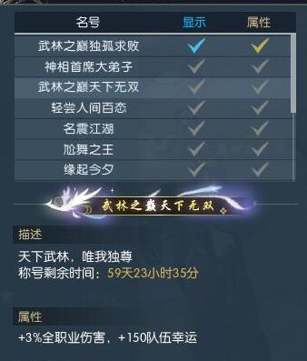 随着比武落幕,首席大弟子获得称号以及得到的Buff加成属性,亮瞎我们的双眼!这个称号走出去,比较“一醉轻王候”拉风多啦!还有独孤求败!这几个字多牛逼啊!全职业+3.5%的加成,真不是虚的。满满的真货啊!想想一个人秒伤1万,就能增强350,等于多出1大件啊!当然我是猜测,还要获得称号的大神给我们说说这个3.5%得历害!再来看看天下无双的属性。